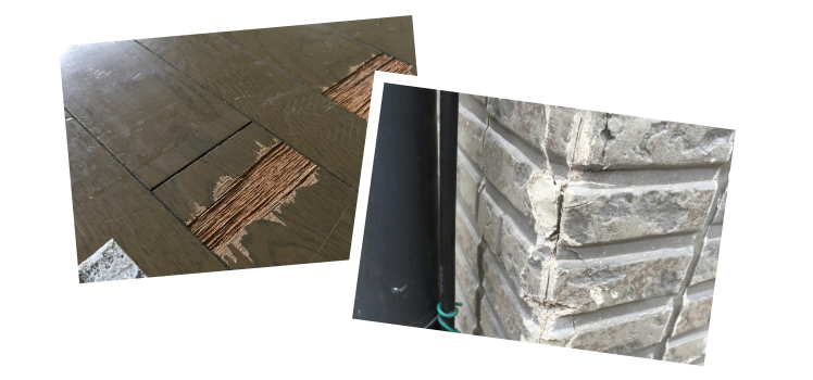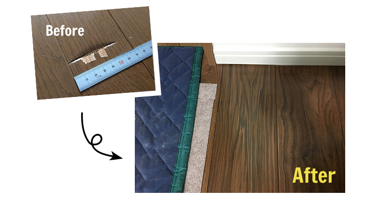 - 建築作業中に工具を落とし、フローリングに凹み傷がつく